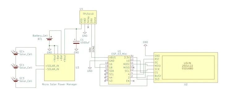 電源鏈路:太陽能板 → SPV1050 → 電池 → TPL5110 →(系統電源)→ ESP32-S3 & 墨水屏。