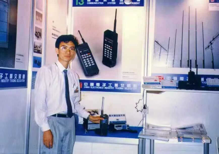 研發負責人湯錦基1993年和中國第一部國產大哥大合影(于香港參展)。