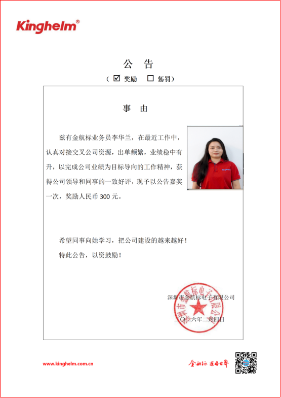 2026年02月02日到2026年02月06日,金航標(www.kinghelm.net)/薩科微(www.slkoric.com)“每周之星”經過同事們評比,這周“每周之星” 是金航標業務員李華蘭,在最近工作中,認真對接交叉公司資源,出單頻繁,業績穩中有升,以完成公司業績為目標導向的工作精神,獲得公司領導和同事的一致好評,現予以公告嘉獎一次,獎勵人民幣300。