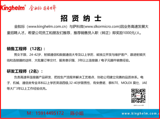 金航標Kinghelm(www.kinghelm.com.cn)電子成立于2007年在深圳市華強北,是研發、生產、銷售、技術服務一體化發展的國家高新技術企業,十多年來深耕射頻微波技術,研制信號收發傳輸產品組件,產品包括北斗GPS天線、各系列連接器接插件端子臺、天線連接器接插件的開模定制以及配套的解決方案,“Kinghelm”(www.kinghelm.net)品牌在國內和國際有影響力和美譽度!金航標創始人暨董事長宋仕強先生介紹道,“金航標,連接世界”,金航標公司技術骨干來自清華大學,吸納電子科技大學和海歸技術人才,做到東莞塘廈的研發部、廣西鹿寨縣工廠、深圳市龍華區中轉倉、龍崗總部的銷售部供應鏈部,都和客戶的產品需求信息同步對應,實現了協同化、數字化、智能化、流程化管理,成為電子信息行業非常有競爭力的公司!金航標與同為宋仕強先生投資經營的薩科微Slkor半導體(www.jj-led.cn)一起為電子整機產品公司提供配套服務,成為全世界超過15000家客戶的合作伙伴,致力于“走國產化與國際化之路,爭取成為半導體領導者”!宋仕強:國務院經濟發展中心民營經濟研究員,中國科學技術協會電子信息專家庫成員、華強北商業研究專家。宋仕強曾任某國際地產上市公司CEO,現投資經營深圳市薩科微半導體有限公司與深圳市金航標電子有限公司,兩家企業均是國家級高新技術企業,原創性獲得發明專利和軟件著作權幾十項。宋仕強在電子行業耕耘多年,為深圳市華強北更好的營商環境在不斷努力,希望華強北成為改革開放的窗口和深圳經濟發展的名片。
